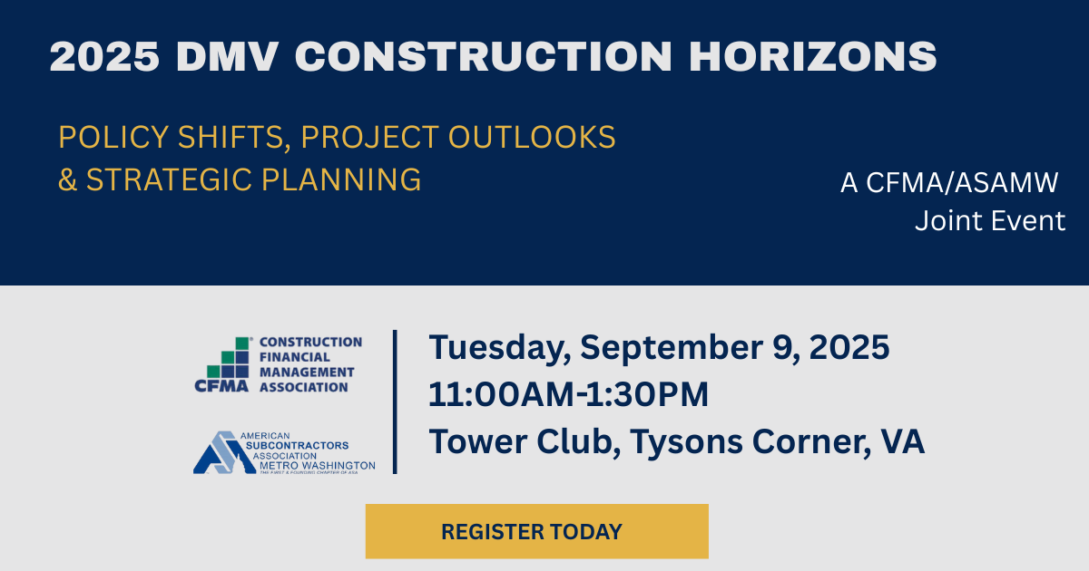 This joint event, hosted by the Construction Financial Management Association (CFMA) and the American Subcontractors Association of Metro Washington (ASAMW), brings together experts from across the construction and finance ecosystem to discuss the latest economic, policy, and operational developments affecting the DMV construction market.